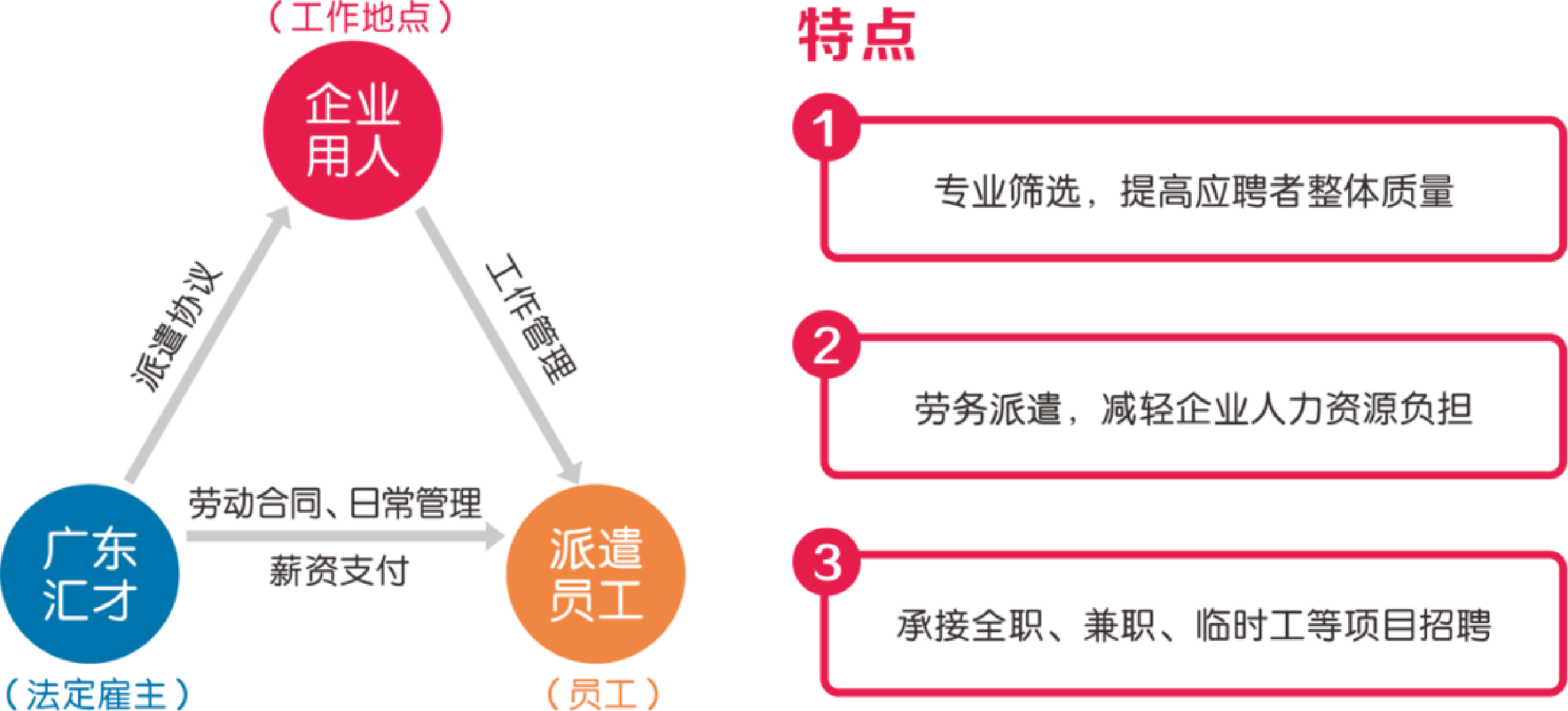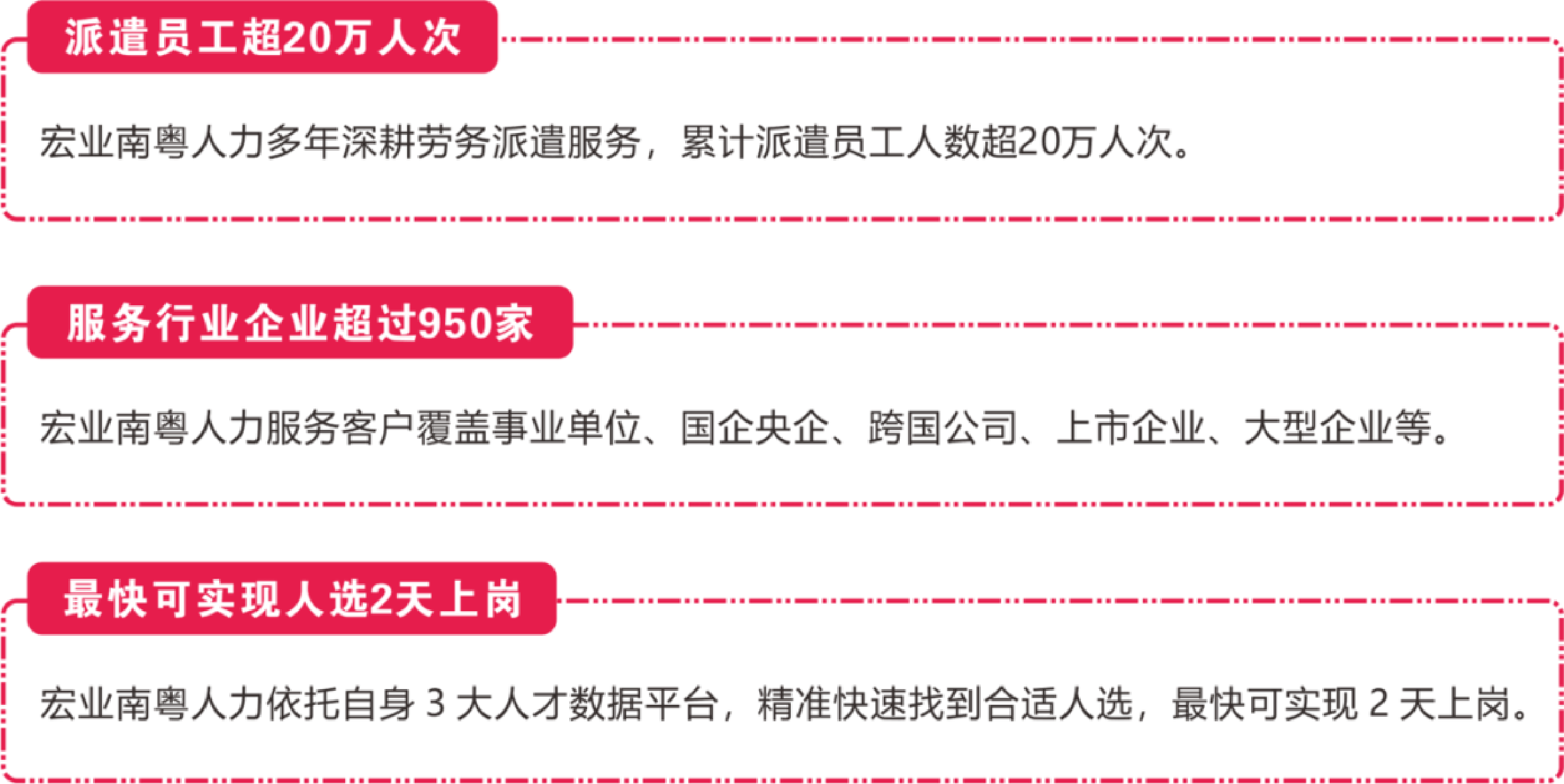 用人單位根據(jù)工作需要,通過(guò)宏業(yè)南粵人力選聘所需人才,并通過(guò)宏業(yè)南粵人力為派遣人員辦理勞動(dòng)合同管理、發(fā)放薪酬、社會(huì)保險(xiǎn)、檔案管理等全方位的人力資源管理服務(wù)。